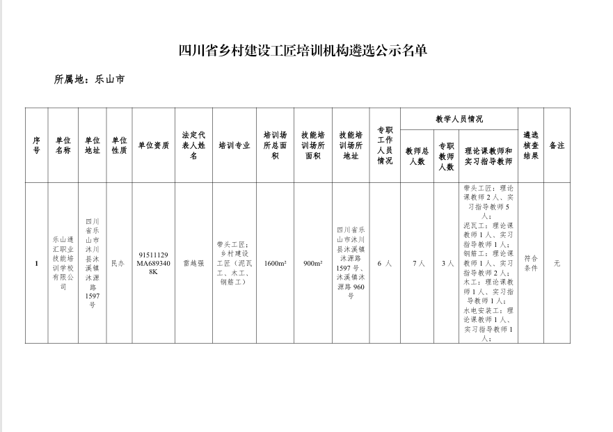 按照《四川省住房和城乡建设厅关于开展全省乡村建设工匠培训机构遴选工作的通知》(川建村镇函〔2024〕3998号)相关要求,乐山市住房和城乡建设局在四川省住房和城乡建设行业技能人员职业培训公共服务平台(工人管理系统)对乐山通汇职业技能培训学校有限公司所申报的材料进行了审核,并会同乐山市人力资源和社会保障局前往实地进行考察。经最终审查,乐山通汇职业技能培训学校有限公司符合培训要求,现进行公示。公示期为2025年10月17日至2025年10月23日。